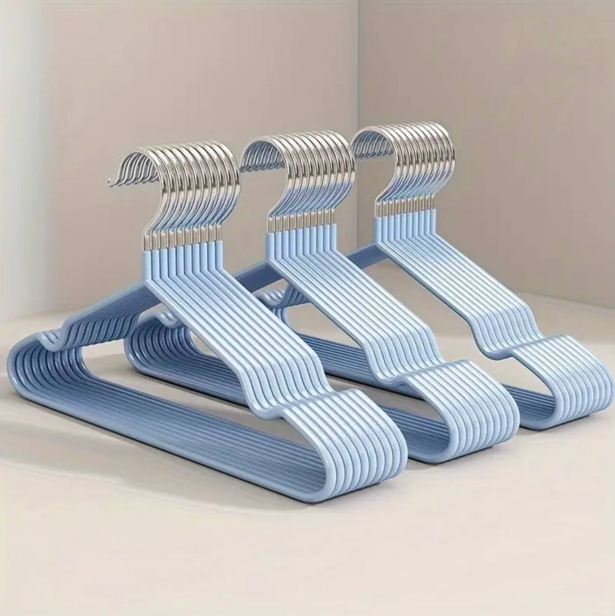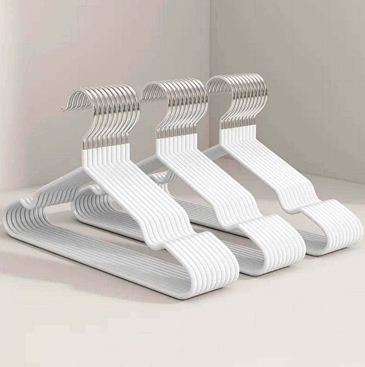 Keep your clothes neatly organized with these 10pcs clothes hangers. Featuring anti-slip grips and stainless steel hooks, they offer durability and prevent garments from slipping. Available in black, white, beige, and blue, they add a stylish touch to any closet.