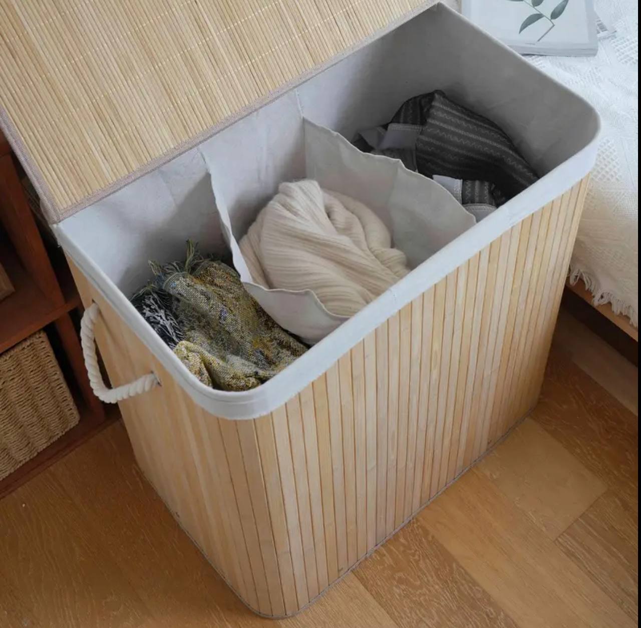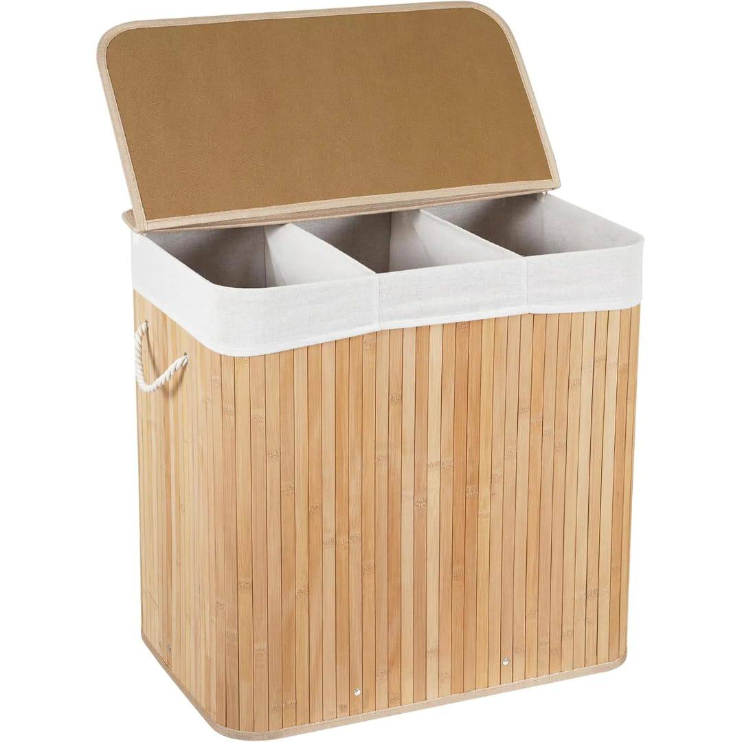 Organize laundry effortlessly with this 3-grid foldable bamboo basket. Generous 62×61×40 cm size offers big capacity, breathable design, and sturdy construction—perfect for sorting clothes while adding a natural, stylish touch to any home.