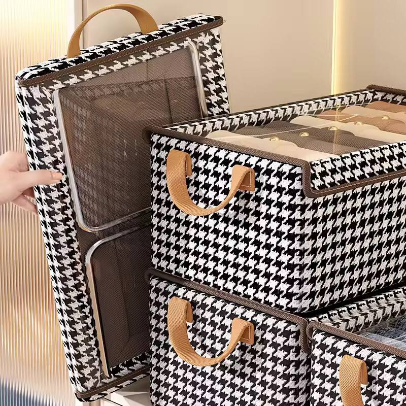 Organize your wardrobe with this foldable Metal Frame Clothes Organizer. Sized at 50×20×30 cm, it features sturdy handles, a transparent dust cover, and a checked design. Perfect for jeans, shirts, and more—durable, space-saving, and easy to access!