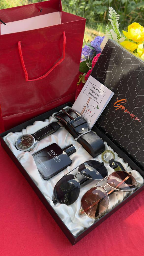 Valentine’s men gift set featuring stylish watch, sunglasses, perfume, belt, and keyholder. Comes with greeting card and gift bag. A classy, practical, and thoughtful surprise to celebrate love and elevate his everyday style.