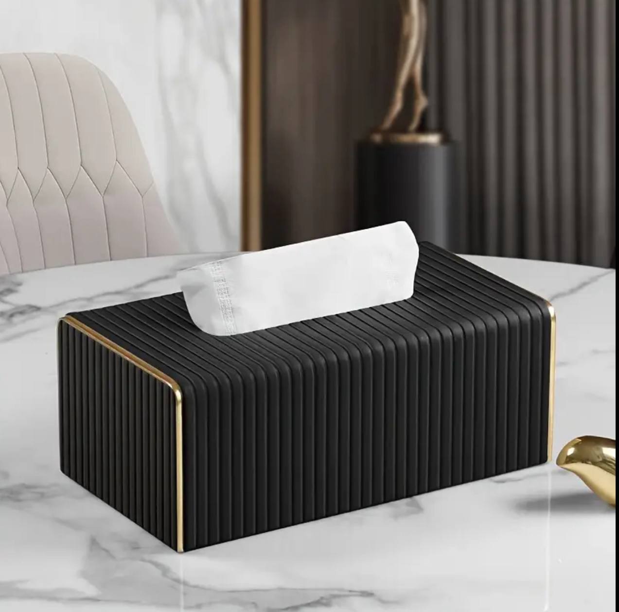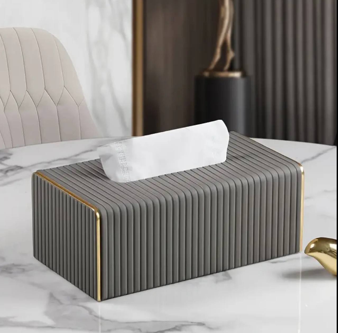 Add elegance to your space with this vertical grooves serviette holder. Made from leather and ABS with gold-accented edges. Stylish, modern design keeps tissues neatly stored and surfaces organized—perfect for home, office, or guest areas.